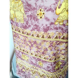 Purple and pink tie dye print with golden yellow elephants, flowers, and other graphics.