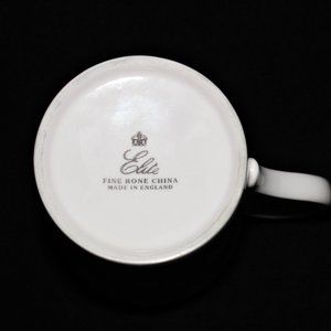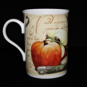 A very pretty mug featuring colourful fruits, flowers, vegetables, and butterflies. There is also Italian writing in the background. Made in England of fine bone china by Elite, the mug is in very good condition without chips, cracks, or crazing. There is some very light stains inside the mug, which is hard to see. There is a very nice ping to the china.