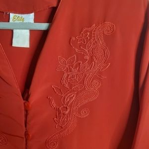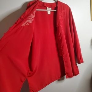 This vibrant red vintage jacket is super light and is perfect for cool evenings or the office. It has stunning embroidery on the chest. There are no visible stains or damages.
