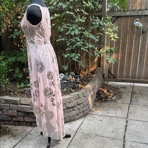 This elegant floral maxi dress features a soft pink hue with a delicate floral pattern in gold metallic print. Perfect for any occasion, it offers a flattering fit and a graceful silhouette and flows when you move.