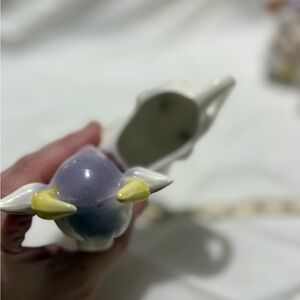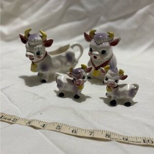 Charming set of ceramic cow figurines with purple and yellow accents. Perfect for collectors. There is a small chip on the ear of the sugar dish.