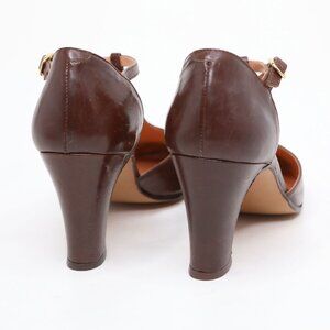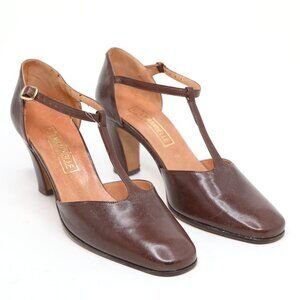 Vintage Emanuelle Brown Leather T-Strap Pumps 80s Chunky Heels Retro Granny