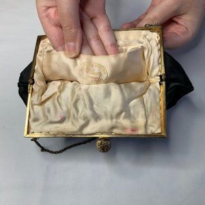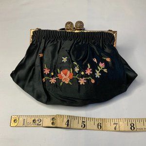 This vintage black satin bag with its embroidered floral design is handmade in France by Point de Beauvais. It features a gold tone metal frame with a kiss lock closure and chain. Condition: has stains in the interior.