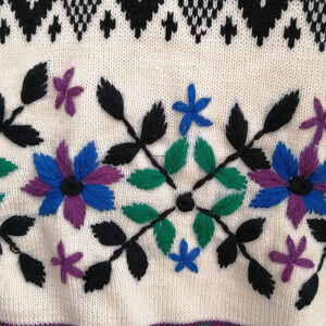 vintage, grandpa, grandma, Norwegian, fair isle, floral, Aztec, embroidered, knit, hand knit, chunky, cosy, cozy, cabin, winter