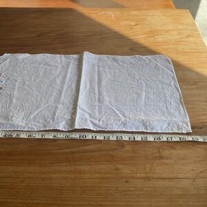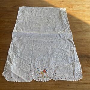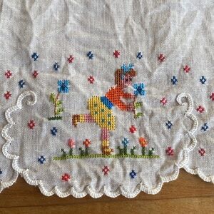 This one is small 11”x 19” with tiny crossstich embroidery of a girl picking flowers. Recently hand washed and laid flat to dry. I was too nervous to iron for fear of wrecking it. In beautiful shape for its vintage age.