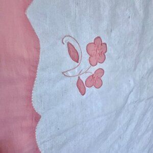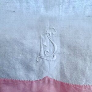 Vintage (pre 1940s) embroidered cream linen tablecloth with pink cotton floral accent and trim. Excellent vintage condition. Monogram initials read "ES". Measures 54 inches by 34.5 inches. Cat friendly, nonsmoking home.