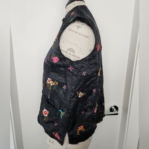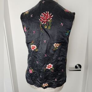Black Satin High Neck Sleeveless Vest with Pockets and Colorful Floral Hand Embroidery, by Plum Blossoms.