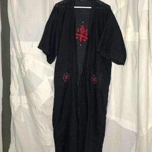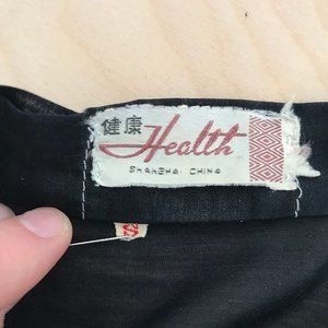 Vintage 80s Shanghai brand 'HEALTH' Silk/Poly Organza Kimono robe. Beatutiful embroidery on the back in tradittional mandarin Hanzi. Pronounced 'le' or 'yue' thiis character means joy and music. The belt is missing. There's a tiny hole above the right pocket.(see photos) Otherwise in excellent vintage condition.