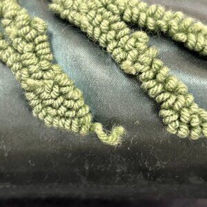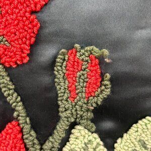 The pillow is embroidered on a dark green satin toile fabric with striking rich red roses crewel design on each. The pillow is stuffed and handsewn shut