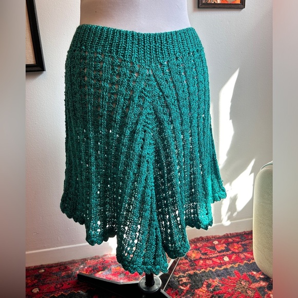This beautiful vintage hand-crocheted skirt is the perfect blend of feminine charm and bohemian flair. Made from a rich emerald green yarn, it features an intricate openwork pattern with a flared, scalloped hemline that moves gracefully with every step. The stretchy waistband allows for a comfortable fit while keeping the silhouette flattering.
