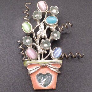 Vintage Enamel Potted Tree Brooch Glass Cats Eye Stone signed KC