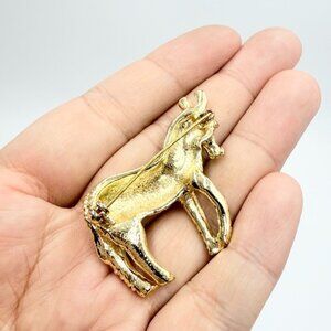 This charming vintage brooch showcases a figural zebra design adorned with black and white enamel stripes, capturing the animal's distinctive pattern. Crafted in a gold-tone metal setting, the brooch features intricate detailing that brings the zebra to life. A secure pin clasp ensures it stays in place, making it a delightful accessory for animal lovers and vintage jewelry enthusiasts alike.