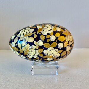 Vintage enameled Chinoiserie style egg, deep navy blue with hand painted cream coloured iris flowers with gold leaves. Very exquisite looking, seems to be a duck egg as it is longer and more oval shaped than a hen's egg. Measures just over 3 inches long. Stand not included. Cat friendly, nonsmoking home.