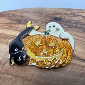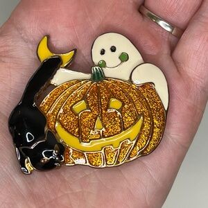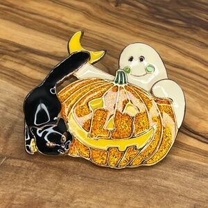 Vintage Enameled Halloween Brooch Pin 3 Ghost, Orange Pumpkin, Black Cat