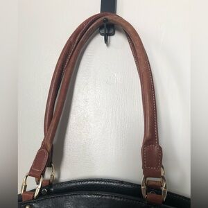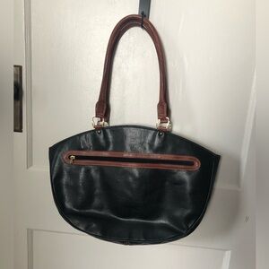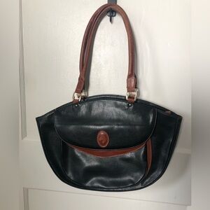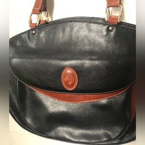 This is a vintage-style handbag with an equestrian aesthetic. It features a structured, semi-circle silhouette in black leather or faux leather, accented with brown faux leather trim and stitching. The bag has a double flap closure with each opening to a pocket and a snap closure. It has an embossed horse logo on the black flap suggesting a brand with equestrian roots. It also has a zipper pocket on the back. The double shoulder straps are also brown leather (?) with gold-tone hardware. It has a classic, timeless look that would appeal to those who love preppy or western-inspired fashion. The main compartment closes with a zipper, it is lined with canvas and has one zipper pocket.