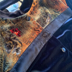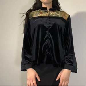 This blouse exudes timeless glamour with its black velvet fabric and exquisite gold accents. It's the perfect piece to make a stylish statement.