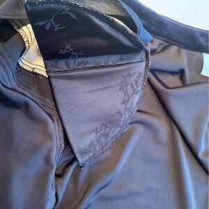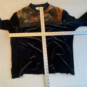 Step back in time and embrace the vintage charm with this black velvet blouse by Erin London Petite, adorned with elegant gold accents. It's designed for women in a comfortable medium size.