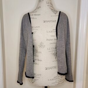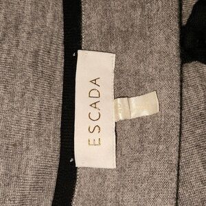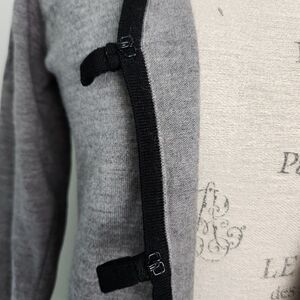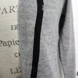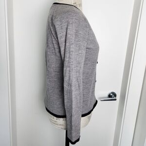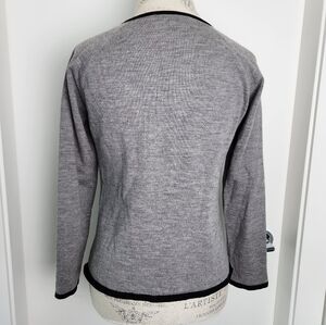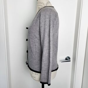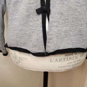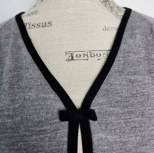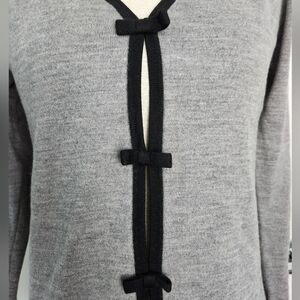 Lightweight tight Grey Knit Vneck Cardigan Sweater with Playful Black Bows and Trim, by upscale Designer Brand ESCADA.