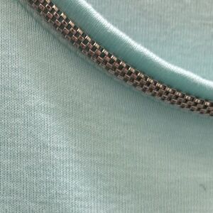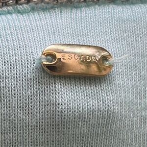 Unique Escada top in gorgeous aqua / robin's egg blue. Neckline has a unique decorative metal chain embroidered into it.