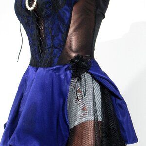 Gorgeous and elaborate satiny sissy dress by Escante! A corset-style lace up front, with a puff skirt with two layers -- one of poofy lace, and an outer layer of purple satin. Love the little lacy hem! There are no size tags present on this high quality lingerie dress. Maximum underarm to underarm is about 19 inches. I think it's ideal with someone with up to a 36 inch chest. About 30 inches long from top of shoulder. Ultra, ultra feminine! Excellent vintage condition, appears NWOT. Note: panties not included.