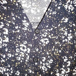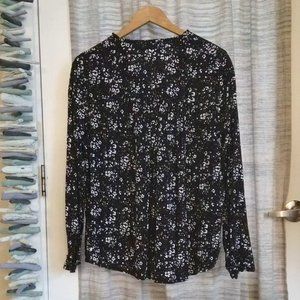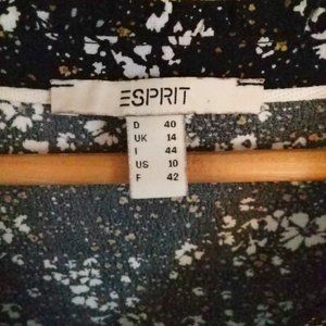 Excellent preowned condition black button up blouse with tiny white and tan abstract floral pattern throughout by Esprit. Can be dressed up with jewelry, blazers and pencil skirts, or dressed down with a pair of jeans and boots. A flowy and pretty shirt with versatility.