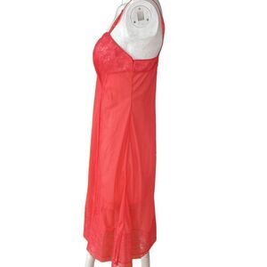 Coral orange colour, nylon, bust 38, adjustable spaghetti straps, lace detail on bust, sides and hem, knee length to midi, sheer, EUC, neck to hem 32”, armpit to armpit 17”. Waist is 17” and hip 19.5”