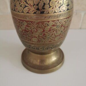 Vintage Etched Brass Vase 12" Indian Handpainted Blue Red Accents Floral Vines