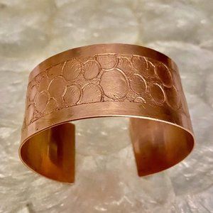 Vintage etched copper cuff bracelet in great vintage condition. Measures 6.75 inches around but as it is a cuff there is some bend to it. Cat friendly, nonsmoking home.