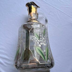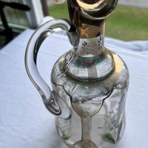 Vintage Etched Leaves and Grapes Glass Pitcher Decanter Jug with Gold Trim