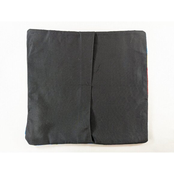 The back of the cover is a sturdy black fabric and the opening for the cushion is still closed.