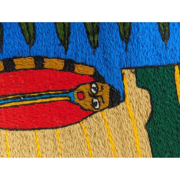 A colourful, fully hand embroidered pillow cover (can also be used as a Challah / Matzah cover) depicting the baby Moses in his basket, floating down the river. This handmade Ethiopian Jewish embroidered pillow cover is a beautiful addition to any Judaica collection. The intricate embroidery is a true work of art, made with care and attention to detail.