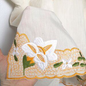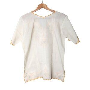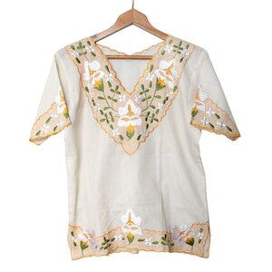 Vintage Ethnic Floral Embroidered Top Short Sleeve Shirt Mexico Yellow Cream