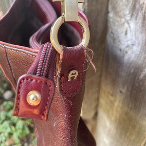 Maroon, 100% genuine leather hand bag by Hungarian designer Etienne Aigner. Gold tone hardware. Brown and red inset suede stripe detail. Inside is like new with signature lining & emblem. Zip closure. Distress on exterior of purse detailed in photos. Purse has been flattened a slight amount from storage but can be restored to full glory with a little bit of use. Width 13". Height 7". Strap length approx 20" therefore not a cross body bag. Three interior compartments include a centre compartment with an open compartment on either side.