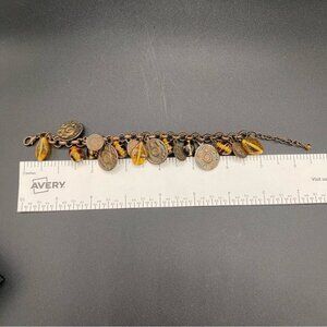 Vintage Etruscan Revival Antiqued Bronze Coin and Amber Glass Charm Bracelet 8in