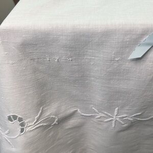 Vintage linen tablecloth, European embroidery, cutwork tablecloth, antique table linen, embroidered tablecloth, heirloom linens, cottagecore decor, farmhouse style, shabby chic, French country, rustic elegance, handmade embroidery, vintage home decor, collectible linens, large tablecloth, timeless tableware, traditional craftsmanship, boho home style, heritage textile, classic dining decor