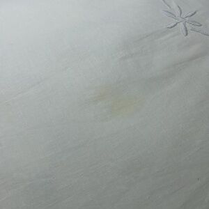 There is a run, noted by the blue sticky paper in the picture. It looks like it was done when making the tablecloth. There is also a very small hole near the edge. It has a few light yellow stains.