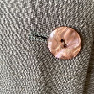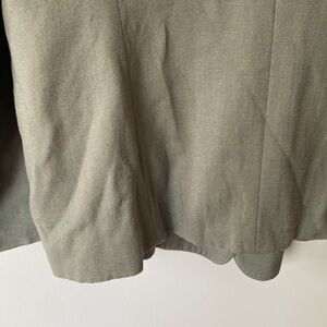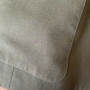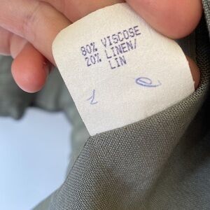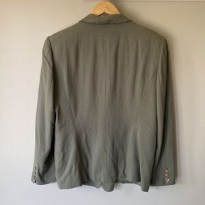 Vintage Evan Picone sage green linen blend blazer. Boxier fit. Classic neutral. Pen mark on one pocket. Some fading. Some texture typical with linen and linen blend.