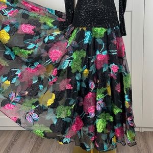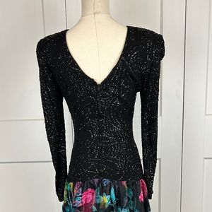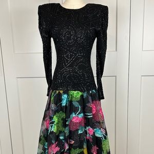 Stunning Piece! Form fitting black top with long sleeves that cuts below the hips in a geometric sparkle pattern. Bottom is a full skirt in Neo coloured floral pattern. Hidden back zipper. Padded Shoulders ( Very Carrie Bradshaw ;) )