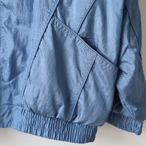 Super cute vintage piece from Exclusiv. Metallic powdery-blue windbreaker with embroidered sailboats on chest. Stand-up collar with toggle ties. Lined. Front zipper closure.
