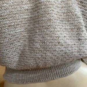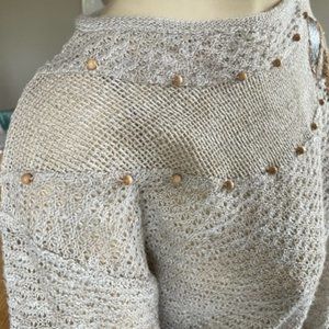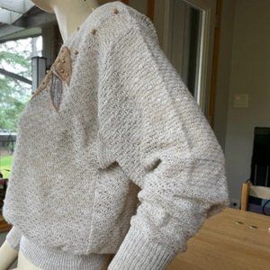Still as unique and fashionable as it was in the 1990’s. The earthtone textures and patterns are combined in a complimentary mix of linen, acrylic, jute, faux snakeskin, and wooden beads. Drop shoulder and dolman sleeve, lots of stretch in the fabric. The sweater fits size 4 - 6, so is a bit large for my 'model'. Measurements when flat and unstretched: between shoulders 43 cm. (17 in.); between pits 46 cm. (18 in.); at waist 27 cm. (10.5 in.); shoulder to sleeve cuff 54.5 cm. (21.5 in.); shoulder to waist 53.3 cm. (21 in.). Excellent condition, no stains, tears, or holes, comes from smoke-free pet-free home.