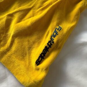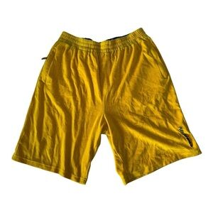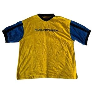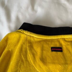 iconic 90s/Y2K era with this vibrant vintage FUBU Athletics velour two-piece set! Features a bold yellow short-sleeved tee with blue sleeves and black trim, embroidered with "FUBU Athletics" in blue. Matching yellow velour shorts with an elasticated drawstring waist and a small embroidered FUBU logo on the leg. Super soft and comfy, perfect for that retro streetwear look.