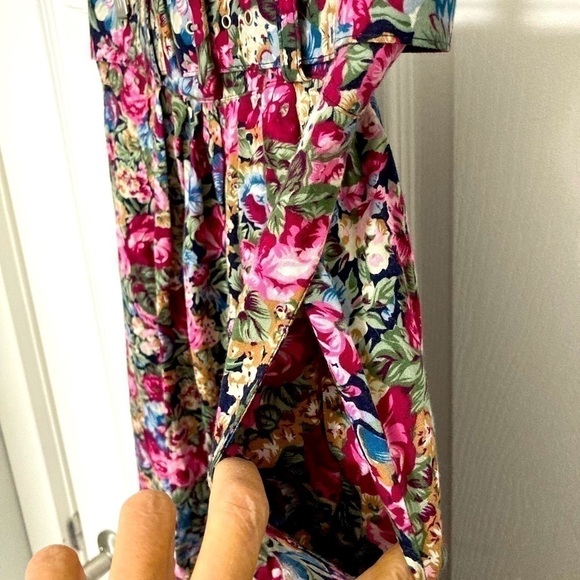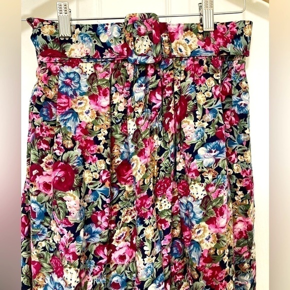 Excellent condition pre-worn vintage floral skirt with belt, elasticized waist, side pockets, pleated