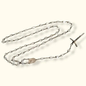 This vintage rosary is made with a silver or gold tone metal and white/clear faceted glass stones. At the point where the chain loops around and meets itself, there is a small silver tone piece with a figure on either side. At the end of the rosary is a cross with Jesus nailed to it. I apologize that I do not know more about rosaries, I hope this is enough information beyond how beautiful it is.