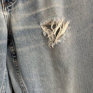 Notable damage: holes, various sites of fraying, small stain on back pocket