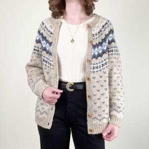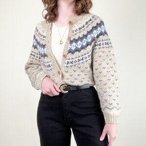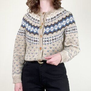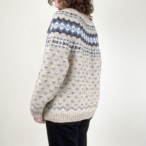 Cozy up in classic style with this unique vintage Fair Isle cardigan, boasting a beautiful blue, brown, tan, and white pattern and an effortlessly oversized fit perfect for layering. This charming and warm wool blend sweater featured wooden buttons that adds a touch of timeless Nordic flair to your wardrobe.