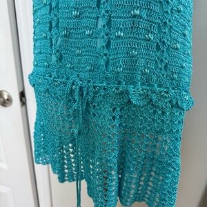 Stay stylish at the beach with this teal crochet swim cover-up. Perfect for adding a touch of elegance to your swimwear ensemble.
