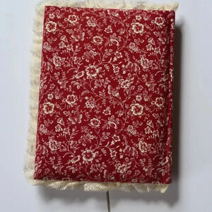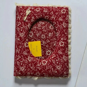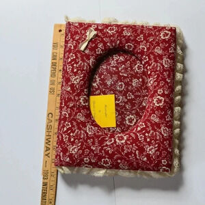 Quilted sort of puffy fabric outside with lace trim, which was hand crafted by Chistel of California.