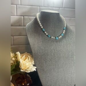 Vintage Faux Blue Turquoise and Faux White Pearl Beads Necklace Silver Tone 18”