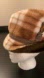 This vintage plaid fedora hat is gently used and in good condition. The hat is faux fur and features a brown and cream plaid design with brown ear flaps, a brown band with orange stitching and a feathers on the side.