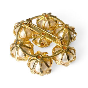 This is a married jewelry set featuring a pretty brooch and a pair of pierced hook earrings. The brooch is circular, with seven faux pearls set in a gold-tone decorated metal frame. The earrings are drop style, each with two faux pearls attached to a gold-tone hook. The faux pearls have a cream color and a glossy finish. The brooch is approximately 2 inches and the earrings the same. In great condition.